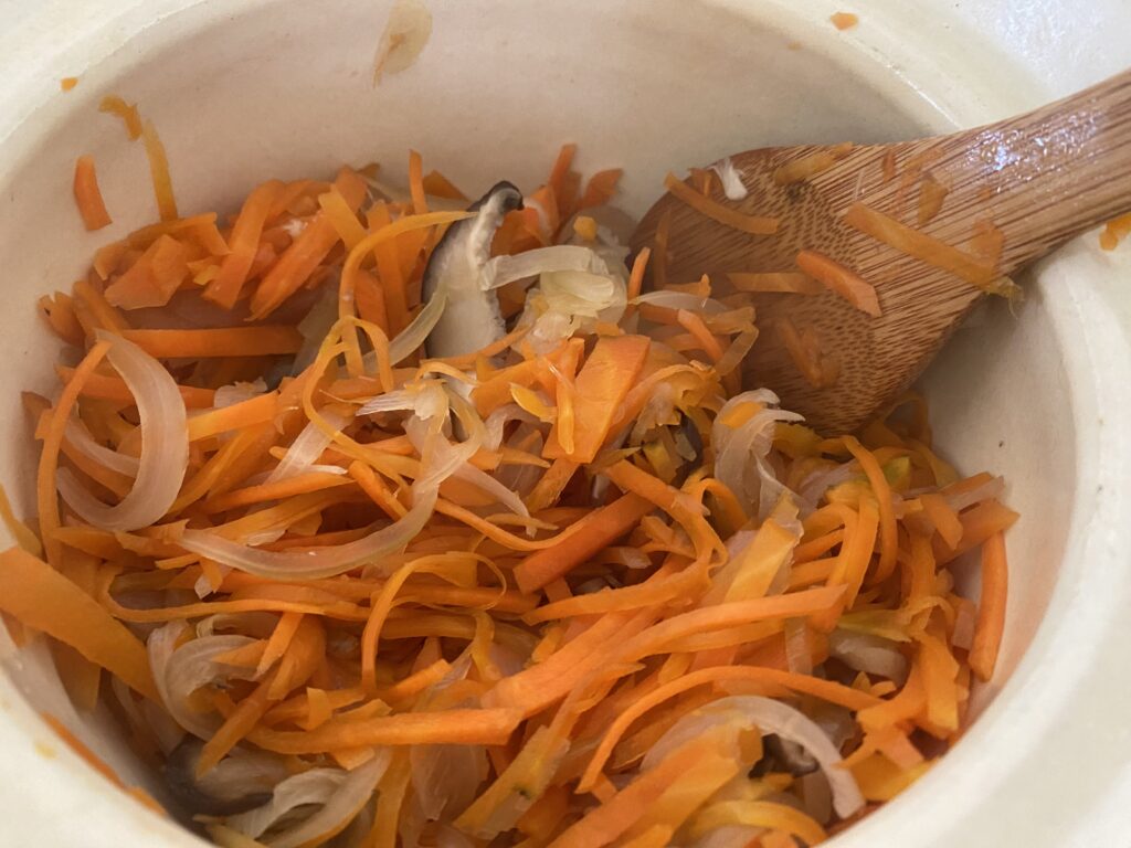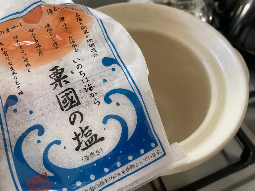 土鍋の底に、塩をまき、しいたけ、玉ねぎ、にんじんの順で入れます。