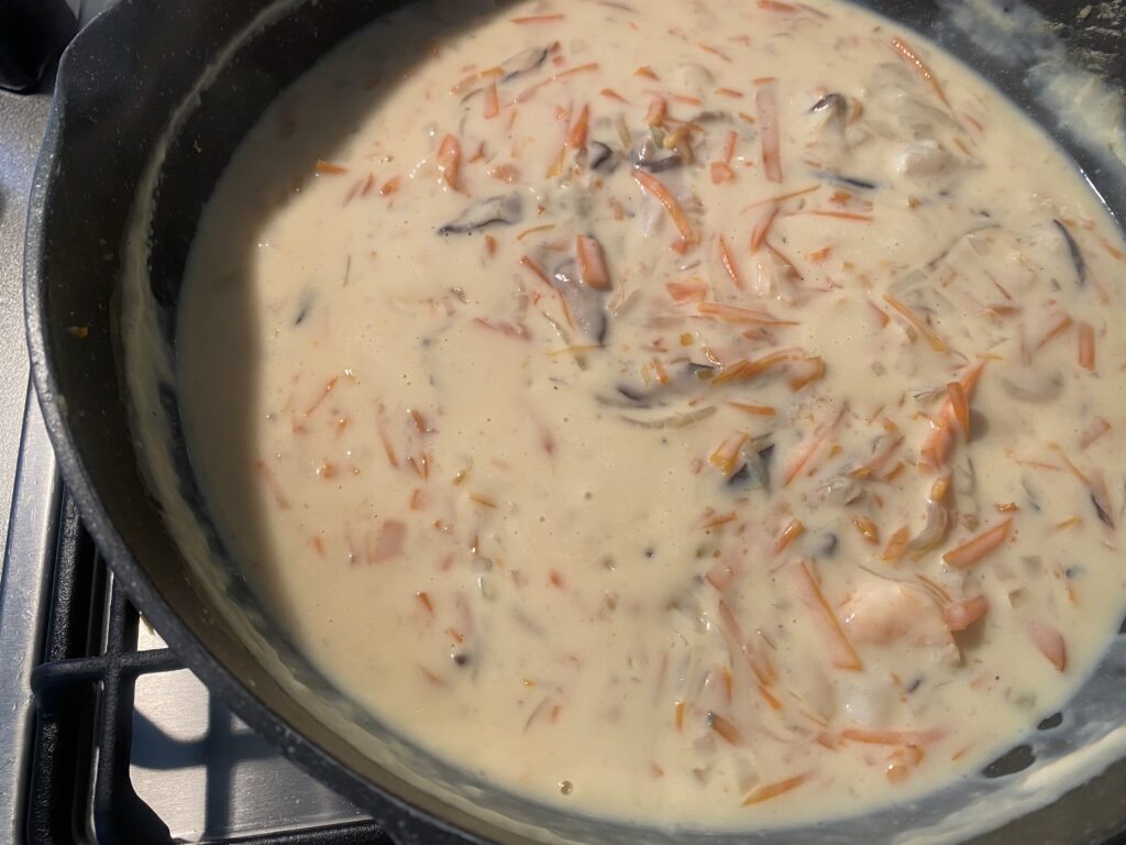 豆乳ベースの具材 こんな感じになりました。 エビとホタテも入ってます。