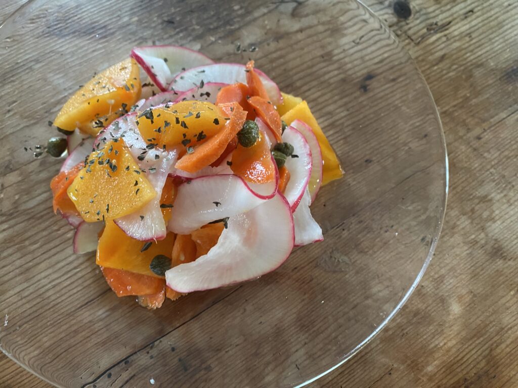 ニンジンや紅大根の玄米麹漬けしておいたものをスライスにして